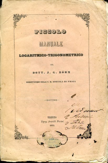 In-8°, pp. 88, brossura editoriale con titolo entro filetto con fregi accantonati. Annotazione del tempo al piatto. Al frontespizio sigillo in ceralacca e firma di possesso di Giuseppe Mussi (Milano, 1836-Baveno, 1904), deputato e senatore per il Partito Radicale (quindi stretto compagno di lotta politica di Cavallotti), Vicepresidente della Camera dal 1892 al 1894, Sindaco di Milano dal 1899 al 1903. Fortunato manuale logaritmico-trigonometrico del Böhm (Rodálovicích, 1807-Praga, 1868), direttore della Specola di Praga.