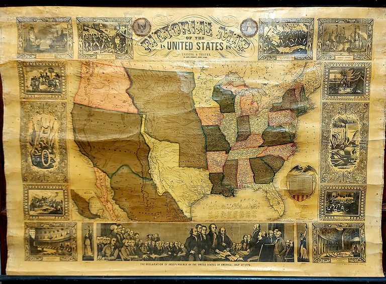 Carta geografica telata degli Stati Uniti d'America, disegnata e incisa in rame da J. M. Atwood, cm 112 x 80 circa, montata su supporti originali in legno. Alcune rotture marginali, abrasioni e segni di stazzonatura. Seconda edizione del 1848 di questa nota e importante carta geografica degli Stati Uniti la cui edizione originale risale all'anno precedente (1847 per la stampa di Ensign, Thayer e Phelps), e che poi conobbe anche edizioni successive nel 1849 e 1850. La cartina centrale e' circondata da 15 vignette illustrate lungo i 4 lati (11 illustrazioni con episodi di storia americana, 2 illustrazioni della Giustizia e della Liberta' personificate, 2 grandi illustrazioni con simboli: armature e armi, e attrezzi agricoli). Le illustrazioni raffigurano: l'arrivo di Cristoforo Colombo, la Constitution contro la Guerriere, la battaglia di Lexington del 1775, la battaglia di Bunker Hill del 1775, la vittoria di Perry, l'arrivo dei Padri Pellegrini, la battaglia di Monterey, la Camera dei Rappresentanti di Washington, la dichiarazione d'indipendenza, la Camera del Senato, la cattura del Generale La Vega. La citta' di San Francisco presenta ancora il nome spagnolo dell'insediamento originale, ovvero Yerba Buena, toponimo che compare solamente nelle cartine uscite tra 1846 e 1849. E' presente inoltre la Nueva Helvetia, la colonia fondata nell'area di Sacramento nell'agosto 1839 dallo svizzero John Sutter (la citta' di Sacramento non e' quindi ancora indicata), mentre il Texas e' delineato con la vecchia configurazione detta "stovepipe" (a tubo di stufa). "The border of J. M. Atwood's Pictorial Map of the United States displays fifteen picture inserts borrowed from popular historical prints and print specimen handbooks. Viewed individually, each picture showed an aspect of the nation's origin story, stretching from the 'Landing of Columbus' and the 'Landing of Pilgrims' to land and sea battles of the Revolutionary War and War of 1812 (Perry's Victory) to the more recent Mexican American War. These historical vignettes were truncated on both sides of the map by allegorical still lifes representing the tools of war and peace, showing the nation's colors and armory on the left, delineating plows and other agricultural equipment on the right." (Bruckner, "The Social Life of Maps in America, 1750-1860", 2017, p. 221).