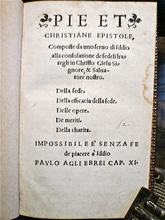 Pie et Christiane Epistole Composte da uno servo di Iddio alla consolatione de fedeli frategli in Christo Giesu Signore, & Salvatore Nostro. Della fede. Della efficacia della fede. Delle opere. De meriti. Della Charita. Impossibile e' senza fede piacere a Iddio (Paulo agli Ebrei Cap. XI) LEGATO A Libretto consolatorio, a li perseguitati per la confessione de la verità Evangelica. Ro. 3. Tutti coloro che vorranno vivere in Christo Giesu, patiranno persecutioni