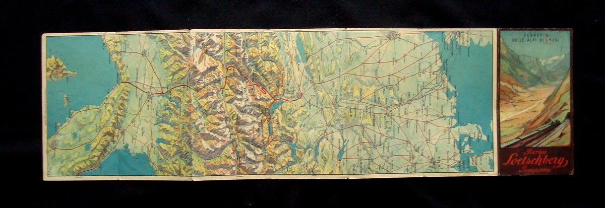 Pieghevole, FERROVIA DELLE ALPI BERNESI BERNA LOETSCHBERG SEMPIONE Offsetdruck des art Institut Orell Füssli, Zurich, s.d., cm 19x10 (chiuso), cm 70x19(aperto); pieghevole a fisarmonica ill a colori con bella dettagliata cartina(vedi foto) e al retro ill. fot. b/n; testo in Italiano. Condizioni di conservazione. Esemplare in buone condizioni con leggere tracce d'uso e del tempo, qualche piccola macchietta e pochi minuscoli strappetti nelle pieghe. OPEB.4798 blu