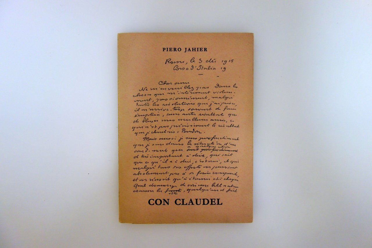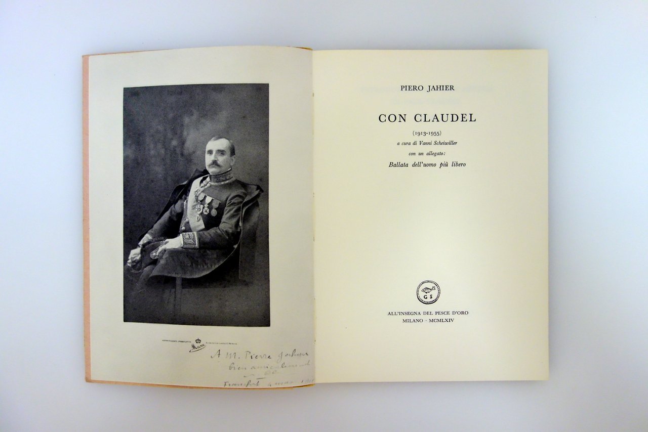 All'Insegna del Pesce d'Oro, Milano, 1964; cm 17x12; pp. 120 con una ill. fotografica in b/n all'antiporta (ritratto del Claudel); brossura ed. ill. Tiratura numerata di 1000 copie, in occasione dell' 80° di Piero Jahier, n/s 205. Alla prima bianca bella dedica autografa del Jahier a penna blu.