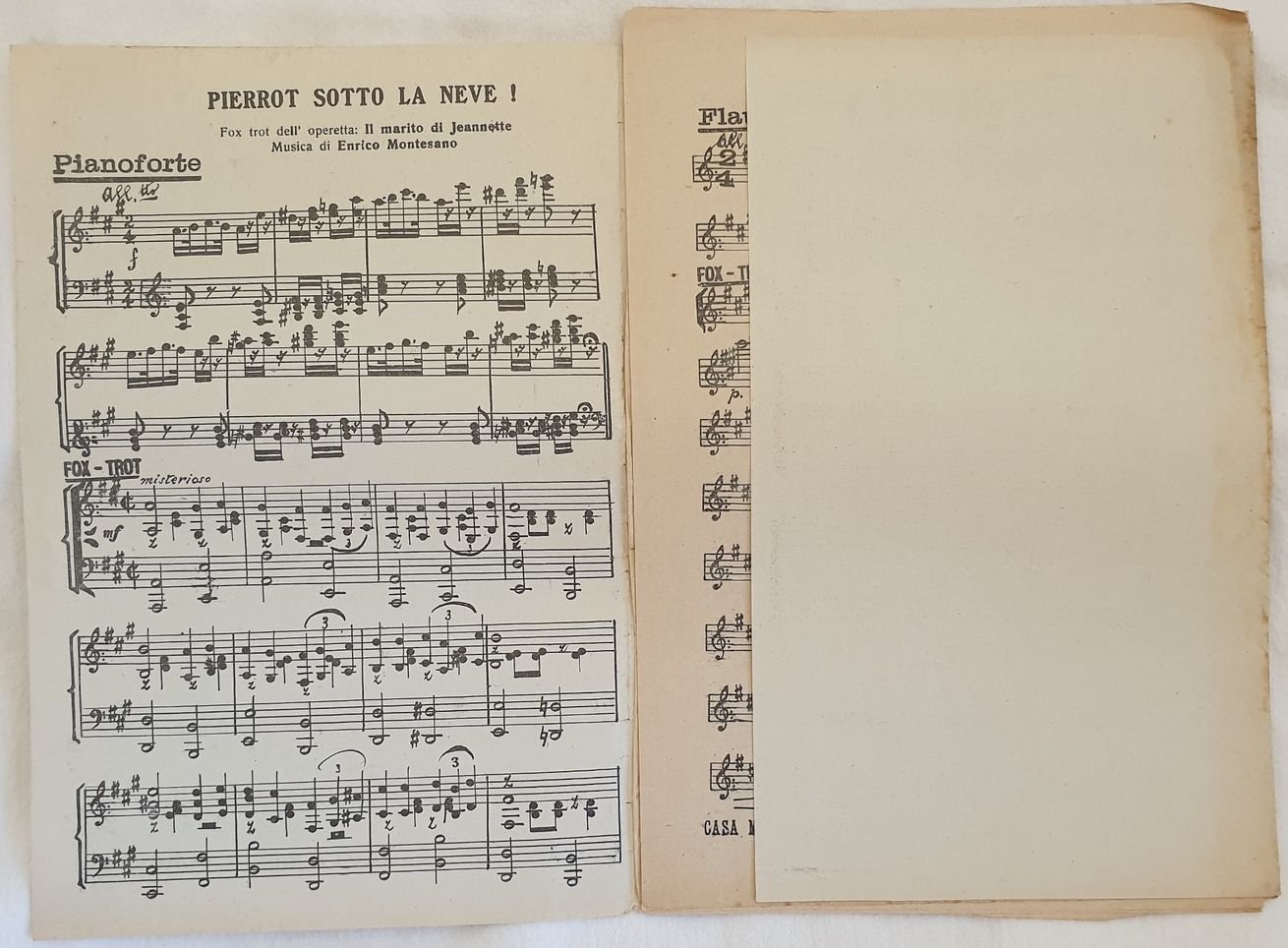 Partitura per orchestra della melodia di Enrico Montesano "Pierrot sotto la neve!" fox trot dell'operetta "Il marito di Jeannette". Copertina assente. GENERE: Fox trot STRUMENTI: pianoforte, violini, basso, cello, tromba, trombone, clarino, flauto, batteria ANNO: anni '20 DIMENSIONI: In 8. cm 25,5x17,5 PAGINE: pp. 12 CONDIZIONI: Buone condizioni. Ex libris in copertina. Complete score for orchestra of 1920's of the melody of Enrico Montesano "Pierrot sotto la neve!" fox trot of the work "Il marito di Jeannette". Cover lacks. MUSIC: Fox trot STRUMENTI: piano, violins, bass, cello, trumpet, trombone, clarion, flute, drums<BR>YEAR: 1920's SIZE: In 8. cm 25,5x17,5 PAGES: pp. 12 CONDITIONS: Goodconditions. Ex libris in the cover