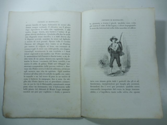 In 8 (cm 15 x 21,5), pp. 30 con illustrazioni in xilografia intercalate al testo. Brossura editoriale con dorso rifatto. Dedica autografa al frontespizio. Bruniture sparse alle pagine. "Semplice e grazioso racconto si e' questo, pieno di verita', di grazie, di soave e cara virtu' ed impresso ancora con singolare eleganza di tipi e con ornamento di belle incisioni in legno rispondenti al soggetto" (La civilta' cattolica, 1861, p. 735). Papanti, 'Catalogo dei novellieri italiani', p. 85.