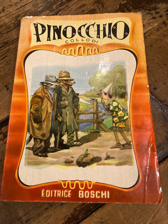 In-8°, pp. 125 (3), brossura editoriale illustrata a colori. 8 tavole a colori f.t. di Moroni Celsi. Rifilato editorialmente in testa, alcuni segni di lettura all' ultima pagina. Collana 'Classici della gioventù, 1'. Più che buon esemplare. Non comune edizione nella felice visualizzazione grafica del Pinocchio ad opera di Guido Moroni Celsi (Roma, 1885-Napoli, 1962) fu apprezzato illustratore di volumi per l'infanzia e per la gioventù (tra tutti i romanzi salgariani) e autore di fumetti per il 'Corriere dei Piccoli'. Fu inoltre collaboratore di periodici come Il Messaggero dei Piccoli, Il Novellino, La Domenica dei Fanciulli, Il Cartoccio dei Piccoli, Viaggi e Avventure, L'avventuroso. Cfr. Biaggioni, p. 176.