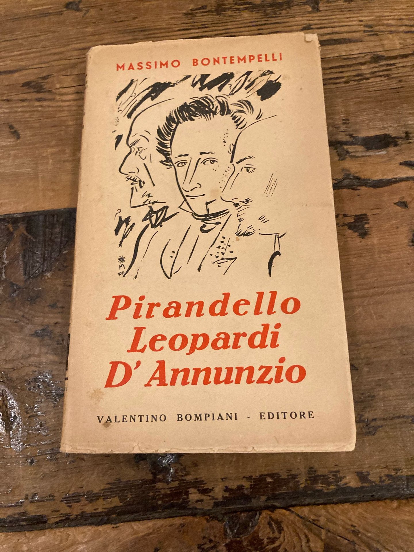 In-8°, pp. 160 (10), brossura editoriale figurata con titoli in nero, ripetuti in rosso e nero alla sovracoperta con alette paratestuali. Bell'esemplare. Seconda edizione di questi tre studi bontempelliani: Pirandello o del candore; Leopardi, L' uomo solo; D' Annunzio o del martirio.
