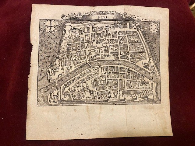 Incisione originale raffigurante la piantina della città di Pisa tratta da: Les delices de l'Italie contenant une description exacte du Pais…Paris, par la Compagnie des Libraires, 1707. L'incisione misura 16,5 x 15,4 il foglio e 14,4 x 10 più cornice, la mappa. Buone le condizioni e l'inchiostratura.