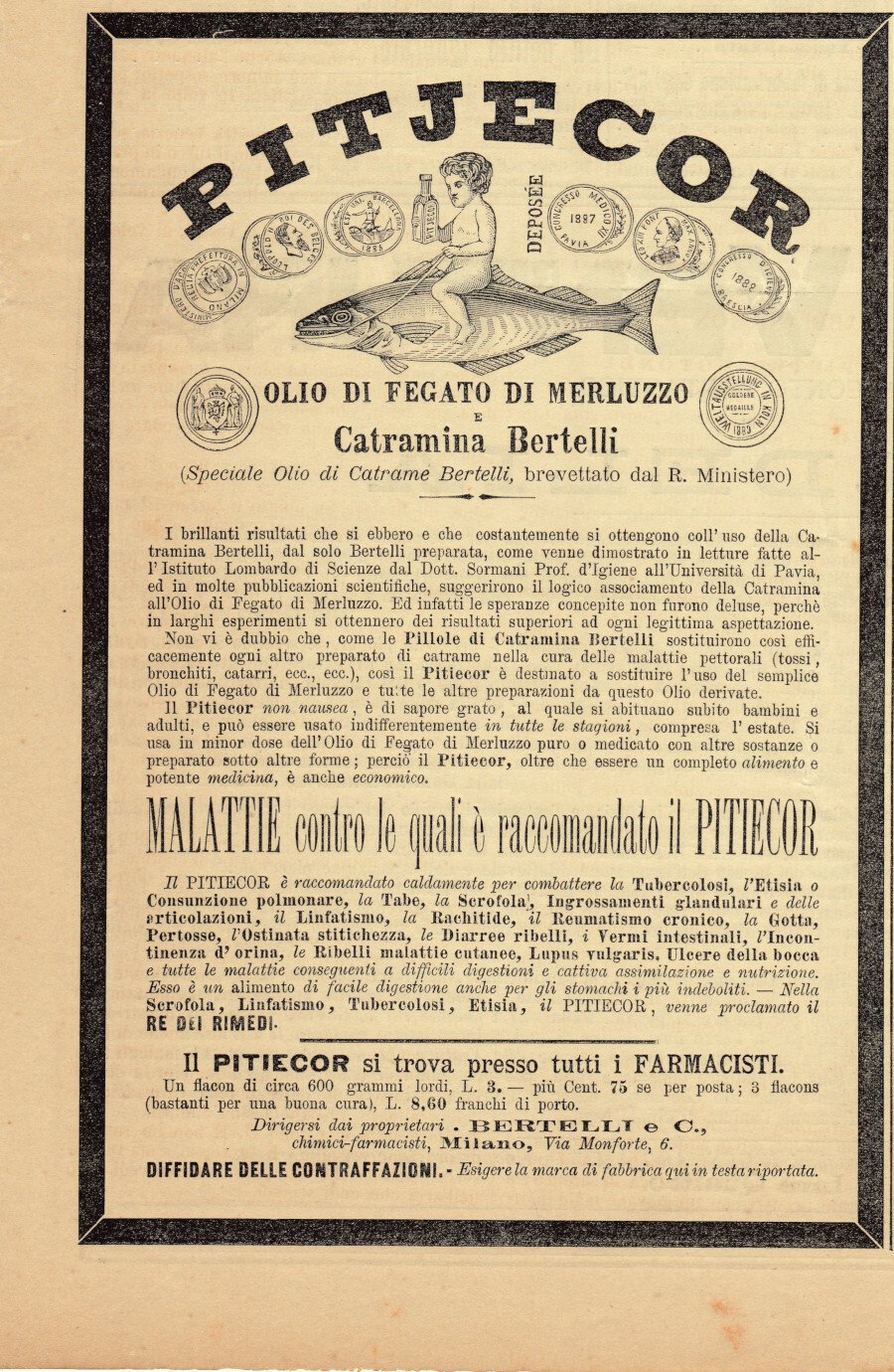Pitjecor, olio di fegato di merluzzo. Bertelli Milano. Advertising 1889