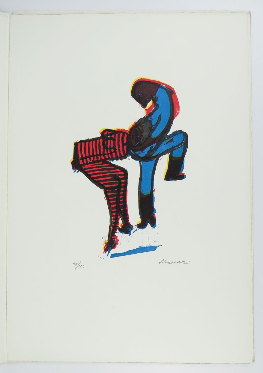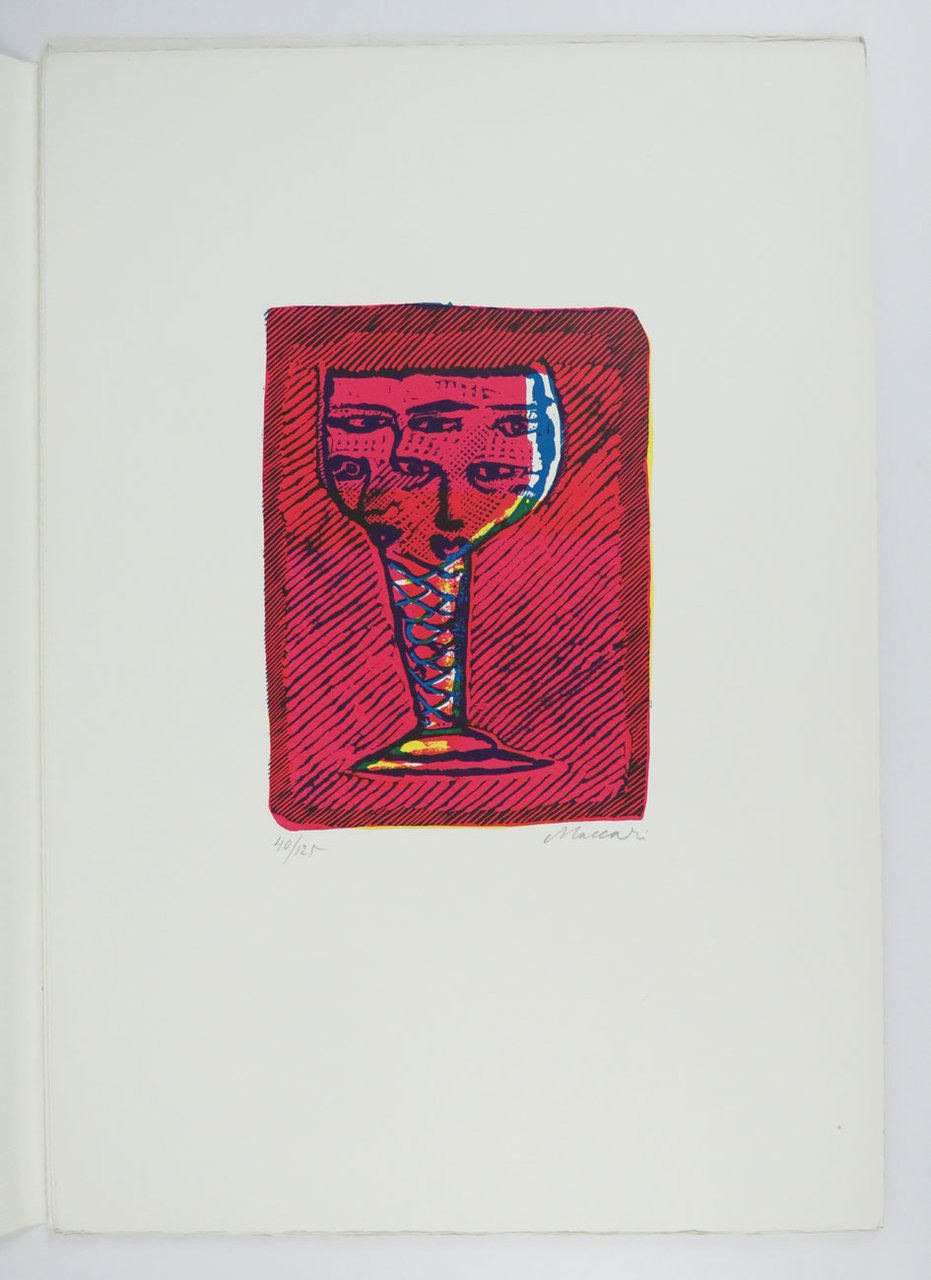 LIBROPrima edizione.CON AUTOGRAFO.Esemplare n. 40/125, in ottime condizioni di conservazione, completo di tutte le tavole numerate e firma te in autografo dall’artista.Rarissima suite di dodici linoleografie a più colori, stampate su carte in folio (50 cm di altezza) in una tiratura numerata e firmata di soli 125 esemplari. Ne fu tirato anche un album più piccolo con le incisioni in monocolore, non firmate, censito in un solo esemplare secondo ICCU (quello del fondo Scheiwiller ad APICE Milano) — mentre di questa versione grande non si ha traccia. Si tratta di una delle cartelle che tra gli anni sessanta e settanta «furono stampate dall’artista eseguendone direttamente la tiratura nel suo studio in via del Leoncino che, aperto nel 1962, divenne presto punto di incontro per amici e collezionisti e luogo di nascita di riviste, almanacchi, fogli volanti e sodalizi, come l’Associazione amatori d’arte o la Inchiostri associati» (Francesca Franco, «Maccari», voce del «Dizionario Biografico degli Italiani» volume 66, 2006: che seguiamo anche per la datazione presunta).