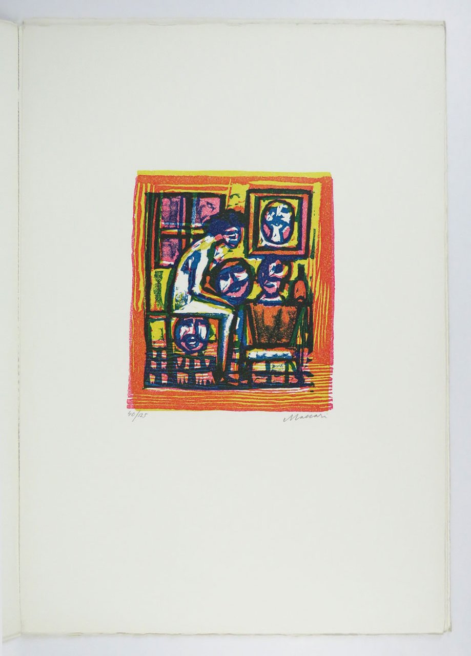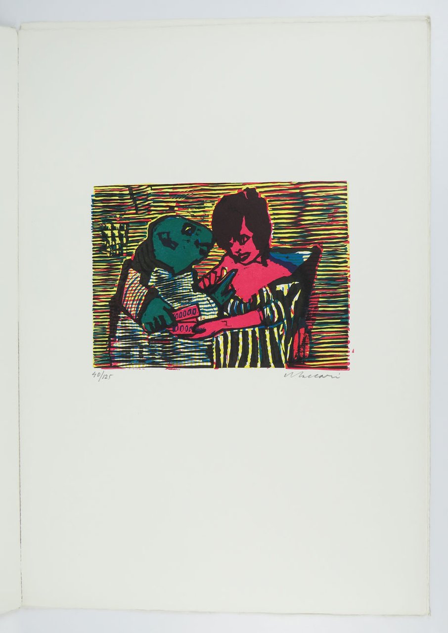- contiene [12] carte di pregio in barbe, ciascuna con linoleografia a più colori numerata e firmata dall’artista.