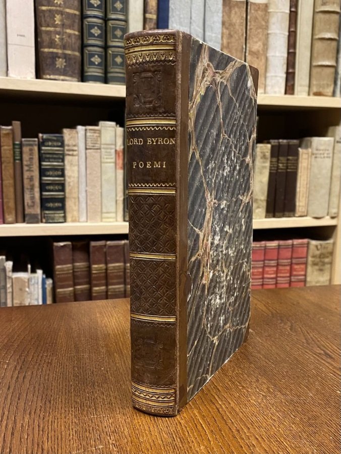 In-8° (cm. 21,4), legatura coeva in mezza pelle con titolo in oro, fregi in oro e a secco al dorso, piatti e risguardi marmorizzati, tagli spruzzati; pp. VI 433 [3] in ottimo stato, con 1 tavola illustrativa in antiporta fuori testo e frontespizio inciso col ritratto del poeta inglese. Bell'edizione che comprende: Corsaro, Sposa d'Abido, Parisina e Lara; nella seconda parte appaioni alcuni componimenti inediti del Nicolini. Ottimo esemplare. (NG1)
