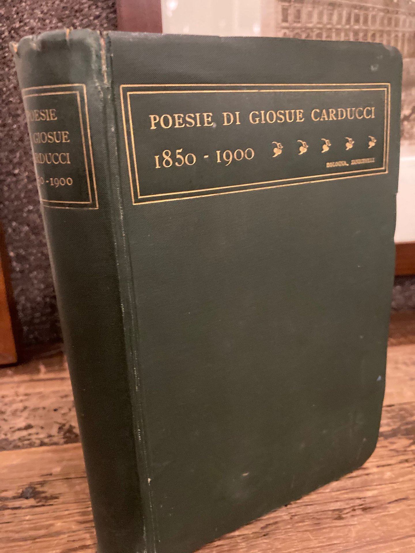 In-8°, pp. XVI, 1075, (1), tela flessibile editoriale nera con titoli dorati al dorso e al piatto anteriore entro cornice, sguardie carta decorata. 2 ritr. e 4 fac-simili di autografi carducciani ripieg. f/t. Testate e finali incisi. Un rinforzo con nastro cartaceo antico al margine interno verso della sguardia anteriore peraltro più che buon esemplare. Settima edizione (prima postuma) della raccolta delle poesie complete del Carducci curata dal poeta stesso (nella prima edizione e successive che sono in pratica ristampe di essa pur cambiando i tipi) elegantemente stampata su carta India.