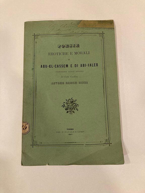 In-8°, pp. 28 nn., brossura editoriale verde con titolo e figura di una rosa entro bordura ornamentale. Annotazion coeva di possesso al piatto. Dedica a stampa a Vittorio Emanuele II. Fregi tipografici n.t. Un restauro con asportazione di parte dell'annotazione coeva alla porzione superiore destra del piatto. Buon esemplare. Non comune saggio di versioni dall'arabo.