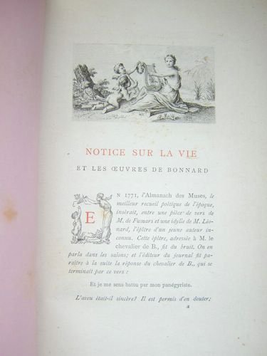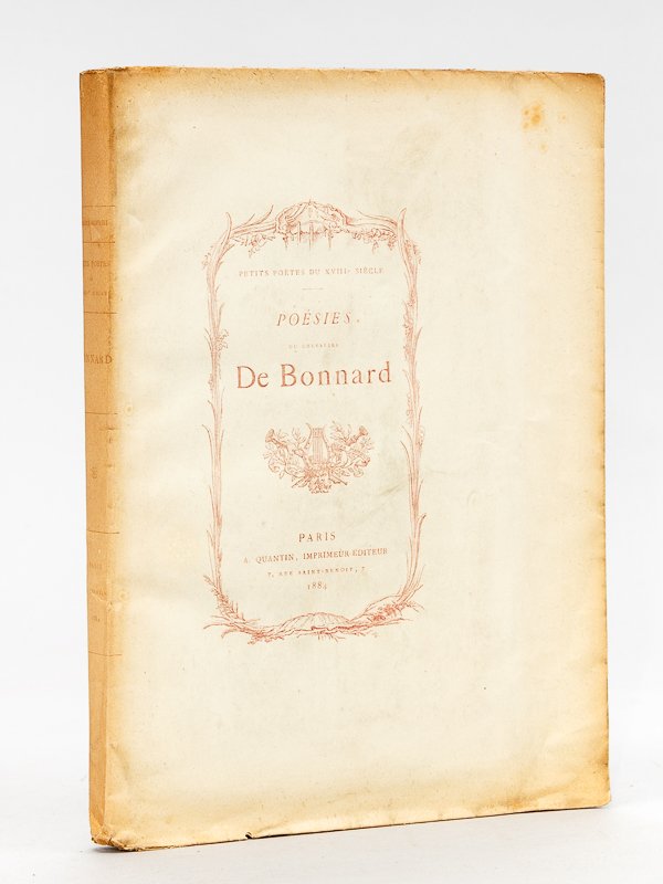Avec une notice bio-bibliographique par H. Martin-Dairvault, un des 50 exemplaires sur Chine numérotés, portrait du Chevalier De Bonnard et une vignette, gravée par Gaujean, hors-texte 1 vol. in-8 br., couv. rempliée, coll. Petits Poètes du XVIIIe siècle, A. Quantin, Paris, 1884, 2 ff., XXXII-265 pp. et 1 f. n. ch. Un des 50 exemplaires sur Chine numéroté, avec 2 suite des des gravures. Bon état (rouss.). Vicaire, VI, 747
