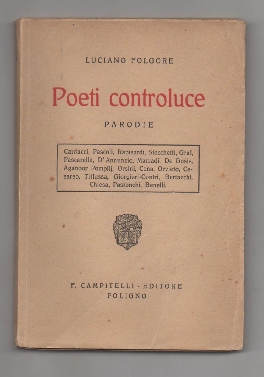 LIBROEdizione originale.Firma d’appartenenza coeva all’angolo alto/interno del frontespizio, coperta ma ancora leggibile; per il resto, ottimo esemplare, il n. 12 di una tiratura non specificata numerata a macchina.Prima tiratura, caratterizzata dai seguenti dettagli: non presente la menzione di «prima serie», data 1922 al colophon, prezzo «Lire Sei» in quarta di copertina. Raffinate e ancor oggi divertentissime parodie da Carducci, Pasoli, Rapisardi, Stecchetti, Graf, Pascarella, D’Annunzio, Marradi, De Bosis, Aganoor Pompilj, Orsini, Cena, Orvieto, Cesareo, Trilussa, Giorgieri-Contri, Bertacchi, Chiesa, Pastonchi, Benelli. Il libro ebbe un meritato successo, tanto da portare nel 1926 alla pubblicazione dei «Poeti allo specchio», «seconda serie» di parodie dedicata ai modernisti: Marinetti, Papini, Ungaretti, Moretti, Moscardelli &c. — in contemporanea alla quale si ebbe una ristampa del primo titolo con aggiunta della menzione di «prima serie». Da riscoprire.Cammarota, Futurismo, 208.9