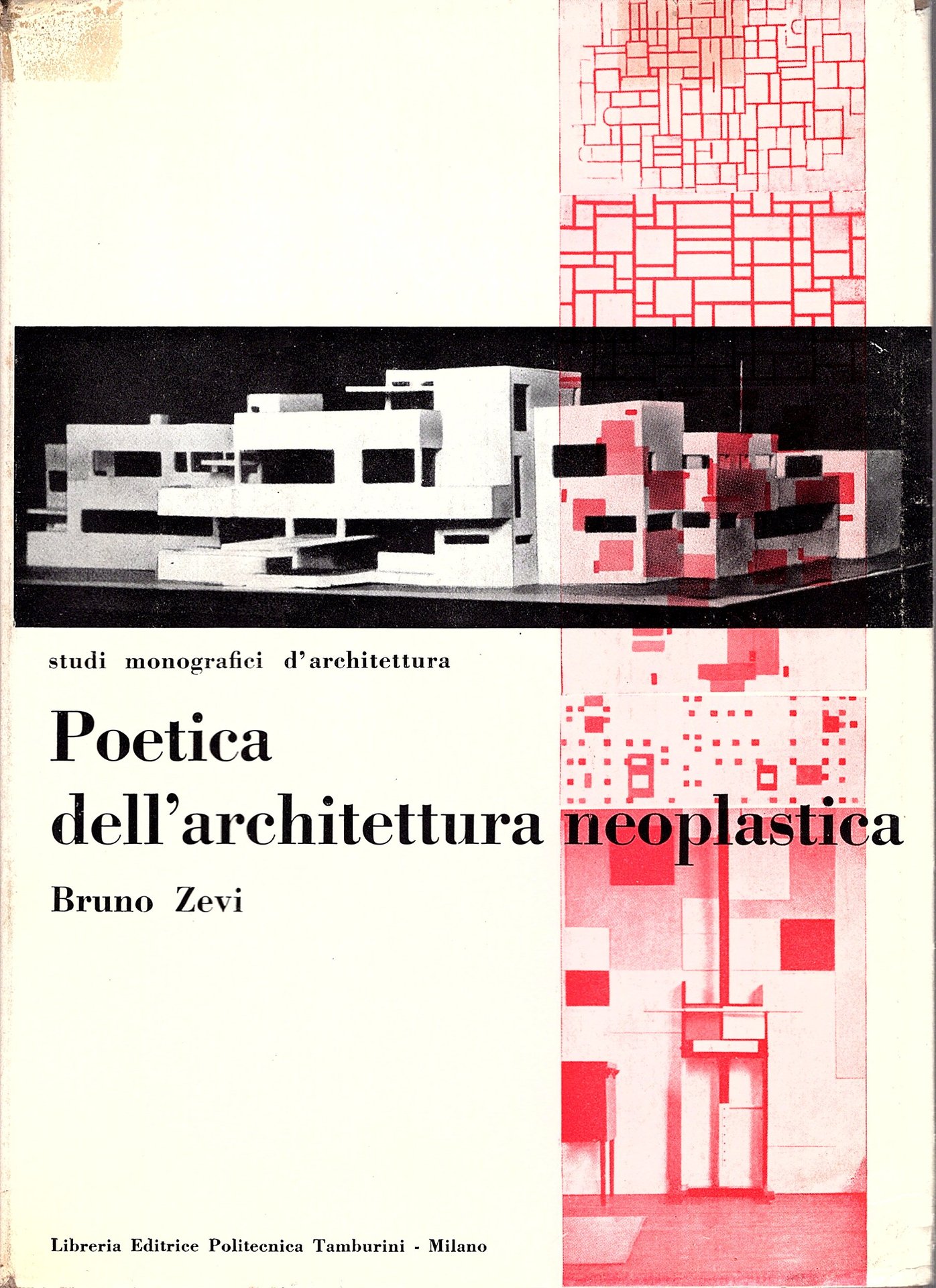 In-8°, pp. 178, (4), brossura editoriale con sovraccoperta illustrata (con minime tracce di nastro). 183 illustrazioni in b.n. f.t. e una tav. a colori f.t. di assonometria di un progetto di casa privata di Van Doesburg e Van Eesteren. Edizione originale di uno dei primi studi organici apparsi in Italia sul Neoplasticismo in relazione all'architettura: Premessa: limiti di una poetica; Theo van Doesburg giunge alla 'Bauhaus'; Storicità del movimento 'De Stijl'; Prosatori e poeti del noeplasticismo; La città neoplastica miraggio di Mondrian; Conclusione: strumentalità critica dell'indagine neoplastica. Il volume discorre anche estesamente di progetti architettonici di Meldelsohn, Gropius, Adolf Meyer, Wright, Berlage, Otto Wagner, Hoffmann, Mackintosh, Kropholler, Oud, Rietveld, Van der Rohe, Unwin e Parker, ecc. Singolarissimi e arditi anche i raffronti tra le soluzioni formali di alcuni edifici antichi e le risultanze dell'architettura neoplastica. Collana 'Studi monografici di architettura'.