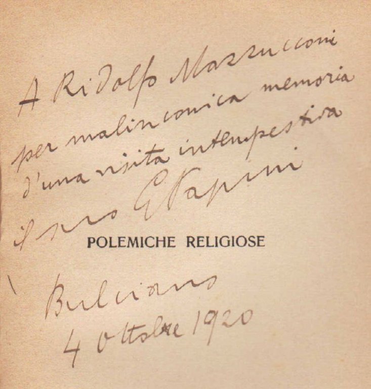 In-8° , legatura editoriale in brossura con fregi tipografici e titoli in rosso e nero; pp. 125(3). Cinquantatreesimo volume della collana 'Cultura dell'Anima'. All'occhiello bella dedica autografa firmata di Papini a Ridolfo MAZZUCCONI (Firenze, 1889 - Forlì, 1959), giornalista e scrittore italiano, '(.) per malinconica memoria d'una visita intempestiva (.)'. Edizione originale, che comprende otto saggi apparsi su periodici diversi. Piccola mancanza della brossura all'estremità inferiore del dorso; aloncino al margine inferiore delle ultime quattro carte; nel complesso ottimo esemplare.