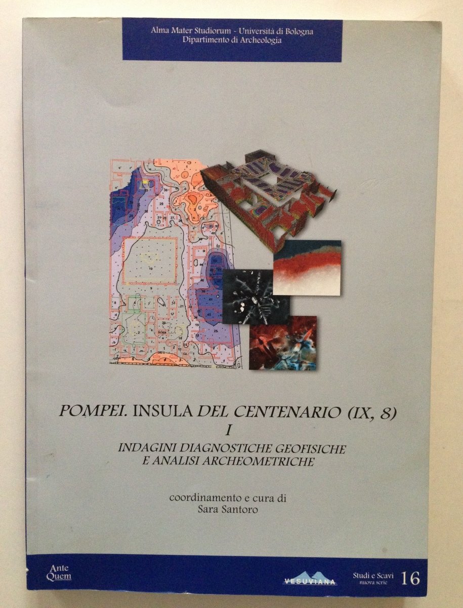 Sara Santoro (a cura di), Insula del centenario (IX, 8) Indagini diagnostiche geofisiche e analisi archeometriche Dipartimento di Archeologia dell'Università di Bologna 2007, cm 29.5x21, pp. 317, moltissime ill. in b/n e a col n.t, cartoncino ed. ill. Condizioni di conservazione Esemplare in buono stato con leggere tracce d'uso. SETT105.L10145 MT