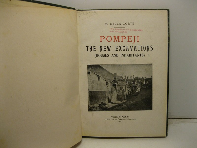 In 8, pp. 80 + (2b) con foto in b/n n.t. Sbiaditure ai p. T. tl. coeva. Breve guida degli ultimi scavi archeologici a Pompei con piantine della citta' e foto di affreschi, vie e case.