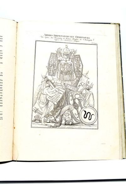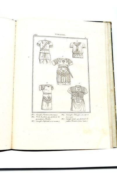 2 pages + 16 pages + XII planches numérotées d'un cahier nommé A + XII planches numérotées (erreur de pagination mais complet des 12 planches du cachier B) (26x35cm). Reliure Ancienne dos Cuir. Coins et mors émoussés. Plats frottés. Coiffes émoussées. Rousseurs éparses. Quelques mouillures angulaires. Assez bon exemplaire à l'intérieur. Très Belles Planches "Armes Défensives et Offensives des Grecs, des Romains et autres Peuples de l'Antiquité", "Cuirasses et Brodequins", "Casques", "Casques et Boucliers", "Enseignes", "Birêmes et Trirêmes", "Bacchus", "Médailles", "Bordures Etrusques". Etc.