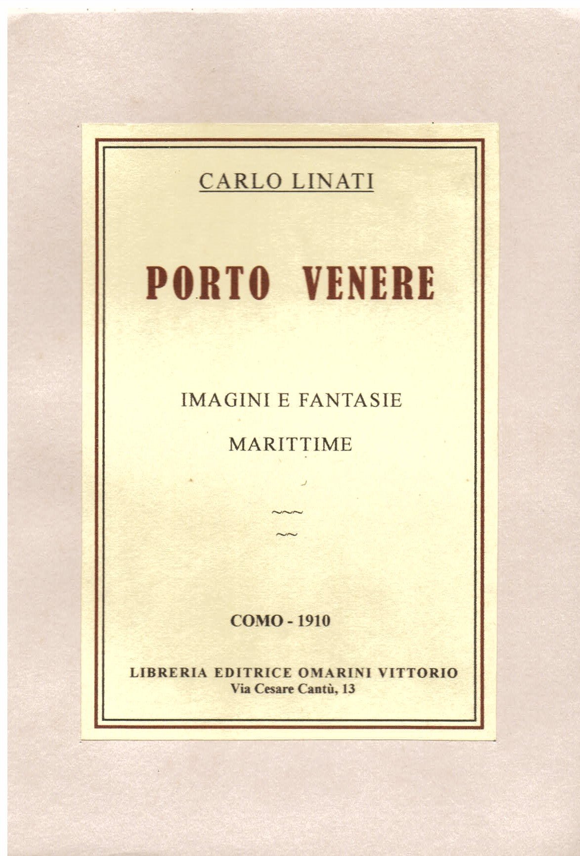 In-8° (225x160mm), pp. 159, brossura moderna rifatta. Ottimo esemplare. Rara edizione originale, impressa in sole 500 copie numerate (n°19). Fra i primi libri di Linati, è una raccolta di prose d'arte che documenta la fascinazione esercitata dalla cittadina ligure sullo scrittore lombardo. Spaducci, p. 159. Gambetti / Vezzosi, p. 449: 'Piuttosto raro e ricercato'.