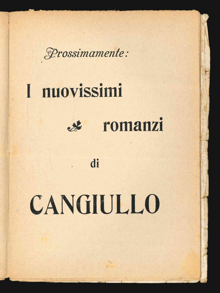 LIBRO Edizione originale. Esemplare proveniente dalla collezione Giampiero Mughini. Rarissimo. Autoritratto dell’autore a piena pagina a p.(5). Nelle 10 pagine finali «Prossimamente: I nuovissimi romanzi di Cangiullo», titoli mai pubblicati. Bibl. Cammarota. Futurismo, 76.17