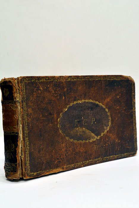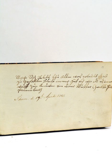 Page de titre imprimée et en couleurs. 130 pages dont 61 sont écrites. (11x18,5 Cm). Plein veau. Guirlande dorée sur les plats. Motif ovale au centre portant les initiales "F.C.P.". Dos lisse orné avec l'inscription dorée "Wir meine Freunde". Tranches dorées (Reliure de l'époque usagée). "Liber Amicorum" composé d'une collection de dédicaces et de vers en allemand (et parfois en polonaises, latin ou français), écrits en hommage au propriétaire du livre (dont les initiales sont probablement les lettres F.C.P. qui figurent sur le plat supérieur du volume). Rédigées en diverses villes polonaise qui appartenaient à la Prusse de l'époque (Danzig, Thorn, Wloclawek), ces notes furent écrites entre 1814 et 1817, à un moment particulièrement convulsif pour ces territoires en raison de la défaite de Napoléon et du début de l'hégémonie prussienne qui s'en suivit. Les textes contiennent ici ou là des allusions à la guerre et par ailleurs de nombreux signataires, hommes et femmes, parfois d'une même famille, ont des noms à consonnance polonaise comme Bielski ou Plewinski. Joli dessin colorié sur l'un des feuillets, représentant un chevalet avec sa toile et ses pinceaux. Quelques salissures.