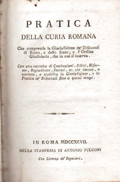 Pratica della Curia Romana che comprende la Giurisdizione de' Tribunali di Roma, e dello Stato; e l'Ordine Giudiziario, che in essi si osserva. Con una raccolta di Costituzioni, Editti, Riforme, Regiudicate, Decreti, ec. che hanno, o variata, o stabilita la Giurisdizione, e la Pratica de' Tribunali fino a questi tempi.