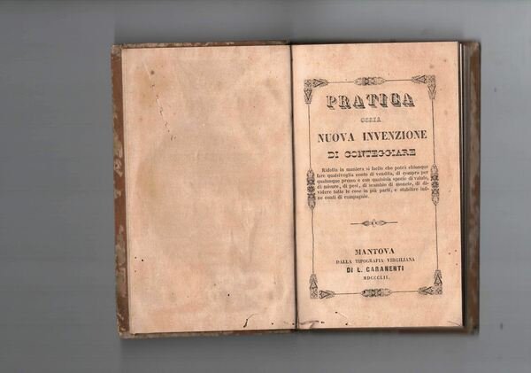 Pratica ossia nuova invenzione di conteggiare. Ridotta in maniera si facile che potrà chiunque fare qualsivoglia conto di vendita, di compra per qualunque prezzo e con qualsiasi specie di valute, di misure , di pesi, di scambio di monete, di dividere tutte le cose in più parti, e stabilire infine conti di compagnie.