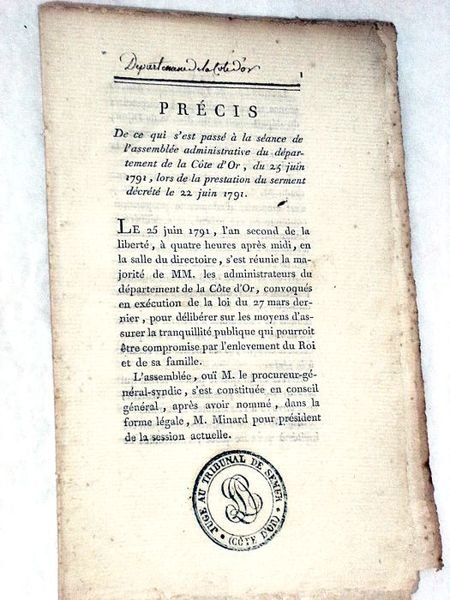 PRÉCIS de ce qui s'est passé à la séance de l'assemblée administrative du département de la Côte d'Or, du 25 juin 1791, lors de la prestation du serment décrété le 22 juin 1791.