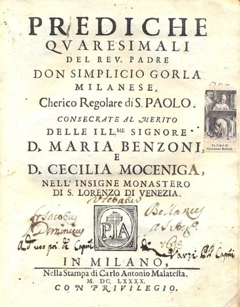 In 8°, cart. muta, cc.nn. 8 + pp. 396. Capilettera, finaline, testata. Appunti sul front. D. parzialmente mancante. Sciolto, collazionato. Antichi forellini che interessano alcune lettere.