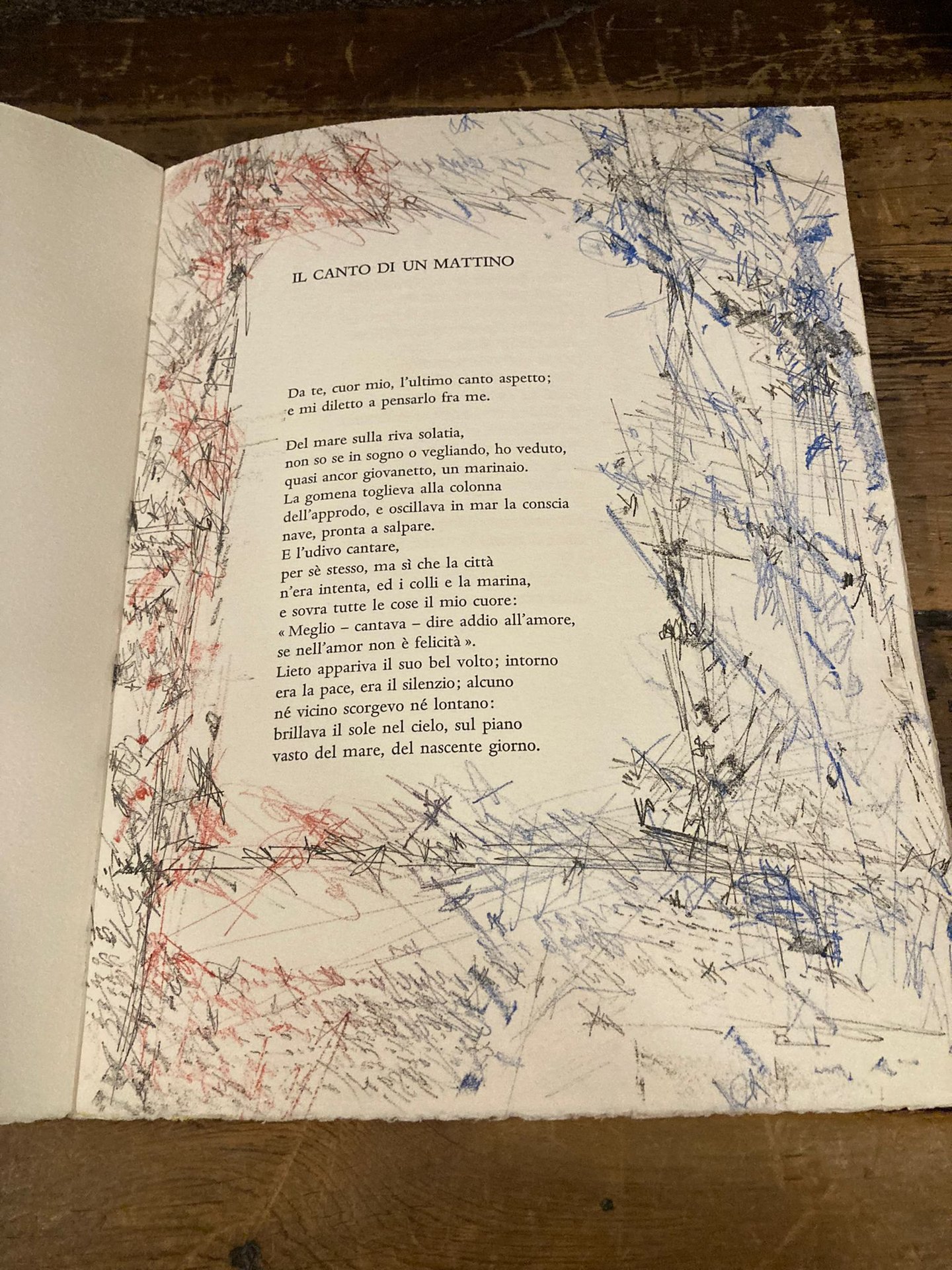 In-4° (34x26 cm), cartonatura floscia editoriale figurata a risvolti con titoli al piatto anteriore, camicia in cartoncino azzurro a risvolti, astuccio in cartoncino muto azzurro. Pp. 54 stampate su carte interamente cromolitografate o incise. Dorso della camicia e astuccio in prossimità del primo scoloriti da esposizione solare. Più che buon esemplare in barbe (uno dei 100 stampati ad personam e non numerati, su un totale di 130). Riedizione di squisita fattura tipografica e iconografica del volume uscito originariamente nel 1923 per le Edizioni di Primo Tempo. A cura dei Cento amici del libro. Nota di Vanni Scheiwiller.