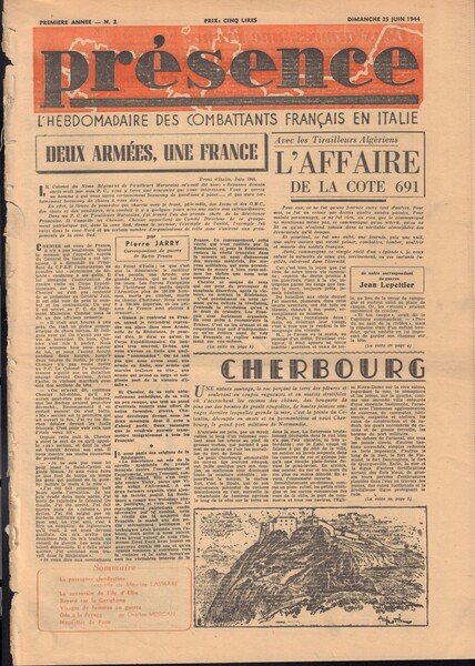 Présence - L'hebdomadaire des Combattants Francais en Italie Premiere annee - N° 2 - Dimanche 25 Juin 1944