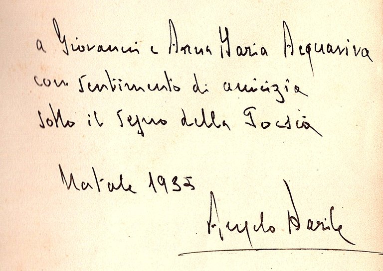 In-8° (20x14cm), pp. 110, (2) brossura editoriale avorio muta, camicia editoriale tabacco con titoli in nero al piatto anteriore entro cornice tipografica. Presente il foglietto di errata (brunito) applicato in fine tra l'ultima pagina e il contropiatto. Biblioteca di Circoli, 6. Ottimo esemplare (n° 345/500) con bella dedica manoscritta dell'autore alla carta bianca anteriore e interessanti annotazioni a lapis presumibilmente dei dedicatari (Giovanni e Anna Maria Acquaviva). Rara prima raccolta poetica a cura di Adriano Grande del letterato e politico compagno di liceo e di lirica di Sbarbaro. Cfr. Gambetti- Vezzosi, p. 61.