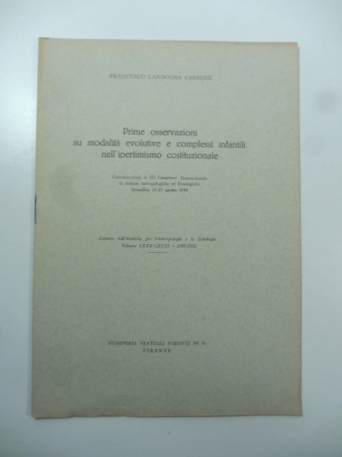 In 8 (cm 17 x 24), pp. (6) con tavola fuori testo con riproduzioni fotografiche. Brossura editoriale. Estratto dall'Archivio per l'Antropologia e la Etnologia.