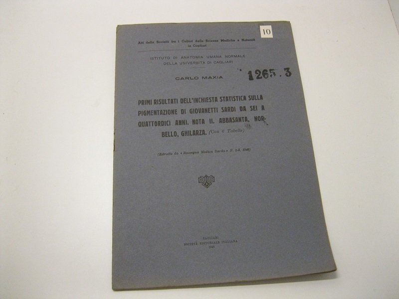 Primi risultati dell'inchiesta statistica sulla pigmentazione di giovanetti sardi da sei a quattordici anni. Nota II. Abbasanta, Norbello, Ghilarza. (Con 6 Tabelle) (Estratto da Rassegna Medica Sarda N.2-3, 1946) Istituto di Anatomia Umana Normale della Universita' di Cagliari