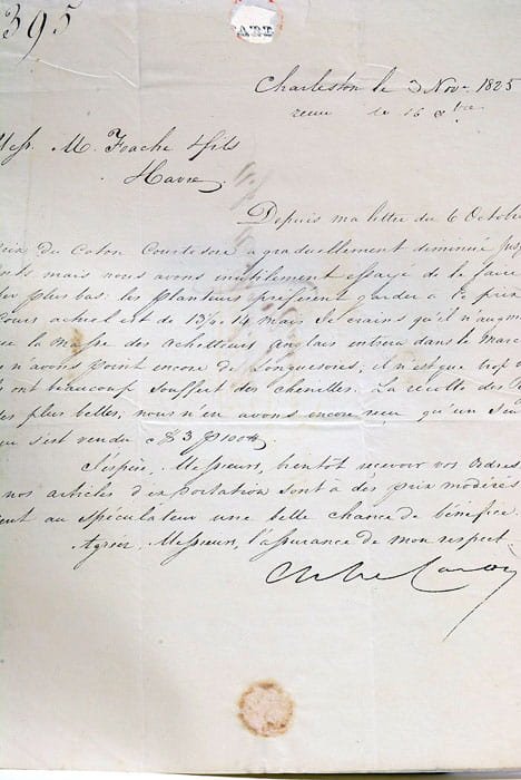 4 feuillets. (25x20 Cm). Broche. Lettre manuscrite de Monsieur Le Caron, négoce international a Charleston et Monsieur Foache, un des "Messieurs du Havre". A cette lettre est attaché une liste de prix courant date le 9 Septembre 1825 et une liste d'exportation de Charleston pendant le mois d'octobre 1825. Dans cette lettre, Le Caron fait part de la diminution du prix du coton et exprime ses craintes quant à une éventuelle augmentation des prix lorsque les Anglais réintégreront le marché. Un témoignage historique précieux sur les fluctuations économiques et les enjeux du commerce international à l'époque. Il exprime egalement ses regrets de ne pas encore pourvoir exporter de longuesoies car l'industrie a trop souffert des chenilles.