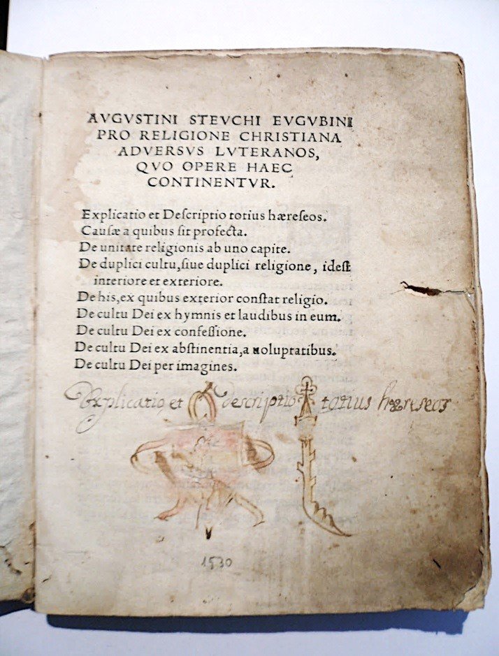 In-4°. (20.0x15.0). (2)+79+(1) carte [manca ult. bianca]. Legatura coeva in piena pergamena con titolo calligrafato verticalmente al dorso. Nota manoscritta e un disegno sul forntespizio. Qualche segno d'uso. Discreto esemplare. Prima e unica edizione italiana. Rara opera antiluterana, tra le prime a essere scritte e stampate in Italia. Steuco, teologo e umanista (1497c.-1548). Nominato nel 1538 da Paolo III vescovo di Kisamos (Creta) e prefetto della Biblioteca Vaticana. Inviato dal Papa al Concilio di Trento, trasferitosi a Bologna, morì durante un suo viaggio a Venezia nel marzo del 1548. Dello stesso autore lo scritto più importante è De perenni philosophia libri X. Lyon, 1540 in cui lautore tenta di mostrare uno sviluppo lento ma uniforme del pensiero e della pietà umana dagli antichi filosofi fino alla Scolastica. Di grande interesse anche laltra sua opera di carattere polemico: Contra Laurentium Vallam, de falsa donazione Costantini. Lyon, S. Gryphius, 1547. EDIT 16/ICCU/CNCE/47875.