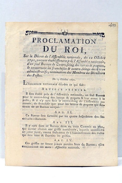 4 pages. (22,5x18 Cm). Dérelié. Publié en 1790 à Grenoble par Cuchet, cet ouvrage officiel du royaume détaille la mise en place d'un nouveau système de gestion des correspondances au sein de l'Assemblée Nationale française. À une époque marquée par d'intenses bouleversements politiques, la réforme visait à centraliser et sécuriser le traitement des lettres et paquets, reflétant les efforts pour instaurer un contrôle administratif efficace dans un contexte de transformation nationale. Les 14 mesures spécifiques qu'il contient illustrent la volonté de réguler les échanges d'informations, essentiels à la coordination des activités gouvernementales et administratives. Document en bon état.