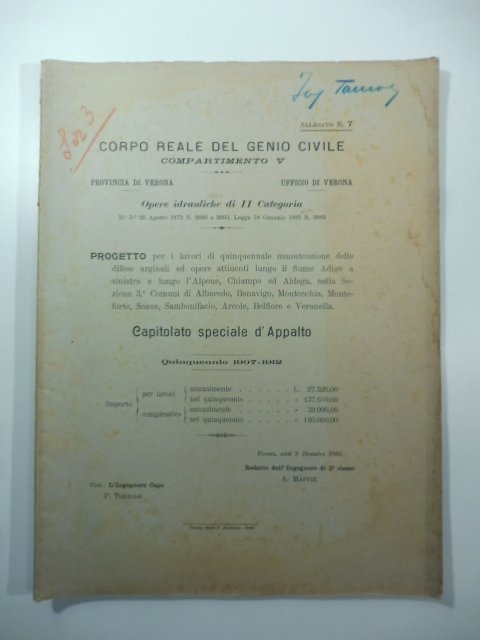 In 4 (cm 24 x 32 circa), pp. 38 + (2) con tabelle nel testo. Brossura editoriale. Capitolato d'appalto del Corpo del Genio civile relativo ai lavori di manutenzione quinquennale delle difese arginali lungo il fiume Adige e lungo l'Alpone, Chiampo ed Aldega nei comuni di Albaredo, Bonavigo, Montecchia, Monteforte, Soave, Sambonifacio, Arcole, Belfiore e Veronella.