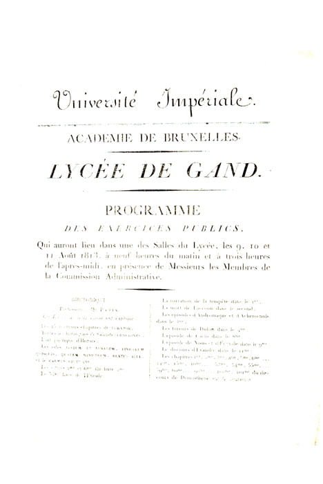 PROGRAMME des Exercices Publics qui auront lieu dans une des Salles du Lycée, les 9, 10 et 11 août 1813, à neuf heures du matin et à trois heures de l'après-midi, en présence de Messieurs les Membres de la Commission Administrative.