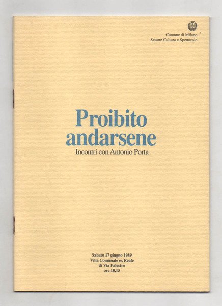 LIBROPrima edizione.Ottimo esemplare (piccole tracce di sporco ai piatti).Curiosa brochure stampata probabilmente in occasione della presentazione della raccolta di scritti su Antonio Porta «Proibito andarsene», pubblicata postuma. Il testo presenta la figura del poeta, elencando le sue numerose opere e prestigiose collaborazioni. Rarissimo.