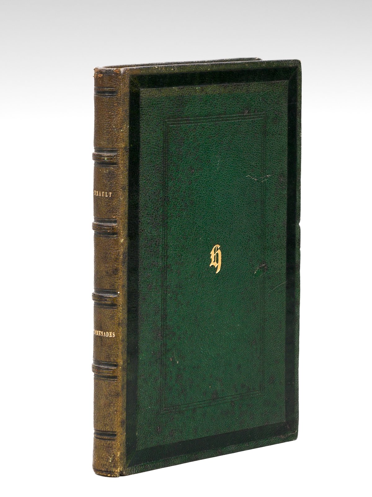 1 vol. in-8 reliure plein chagrin vert, dos à 4 nerfs, filet doré en coupes et chasses, toutes tranches dorées, initiales chiffrées au premier plat, Imprimerie de St-Ange Duvant fils et Cie, Bayeux, 1852, 1 f., 321 pp. et 1 f. Très rare exemplaire de l'édition originale. Il s'agit du premier ouvrage de Louis Enault (1820-1900), publié après sa thèse sur Eschyle. Il collaborera avec Gustave Doré pour l'important volume consacré à "Londres" et traduira notamment "La Case de l'oncle Tom" ou "Werther" de Goethe. Bon état (qq. rouss., petit frott. en coiffe sup.)