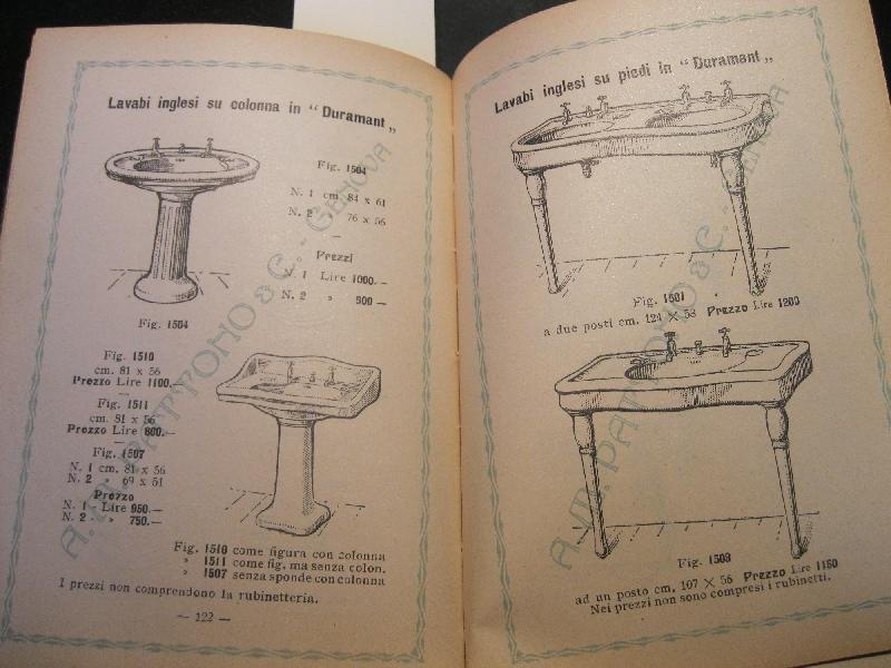 In 24, pp. 332 con alcuni fogli bianchi quadrettati in fine per appunti. Legatura in p. pl. editoriale. Catalogo illustrato dei molti articoli prodotti da questa ditta: vasche da bagno, lavabi, lavatoi, rubinetti, contatori per acqua, wc, orinatoi, pompe, fornelli a gas, lampade in acetilene, ecc. Due tavv. f.t. a colori con ill.