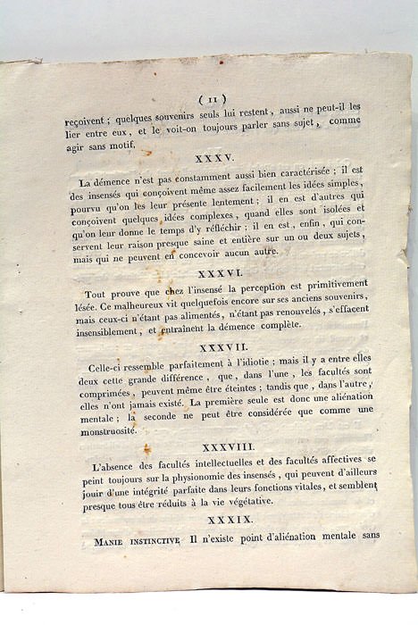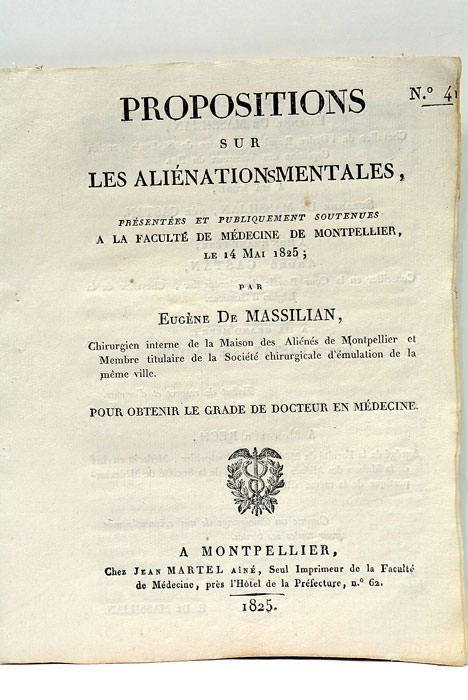 23 pages. (22x17 Cm). Dérelié. Petites rousseurs. Le chirurgien Massilian reprend point par point toutes les aliénations mentales connues, ou ce qu'il appelle aussi "dérangements de la raison". Reliure fragilisée. Document frais.