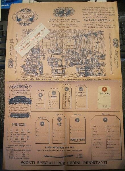 Bifoglio cm 34 x 50 ripiegato. Grande illustrazione xilogr. in apertura raff. lo stabilimento, varie illustraioni raff. le diverse tipologie di etichette stampate da questa ditta. Due etichette sono inoltre applicate su carta.