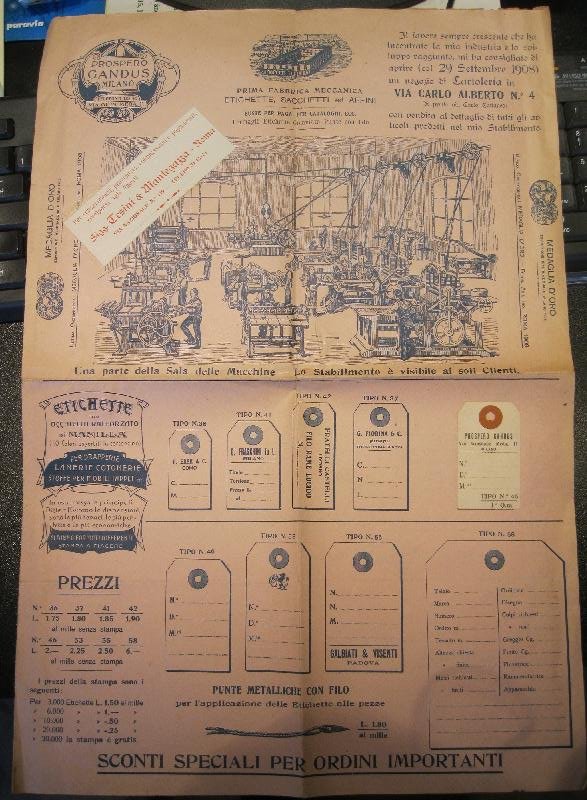 Prospero Gandus, Milano. Prima fabbrica meccanica etichette, sacchetti ed affini. Buste per paga, per cataloghi, ecc. fermagli, etichette gommate punte con filo