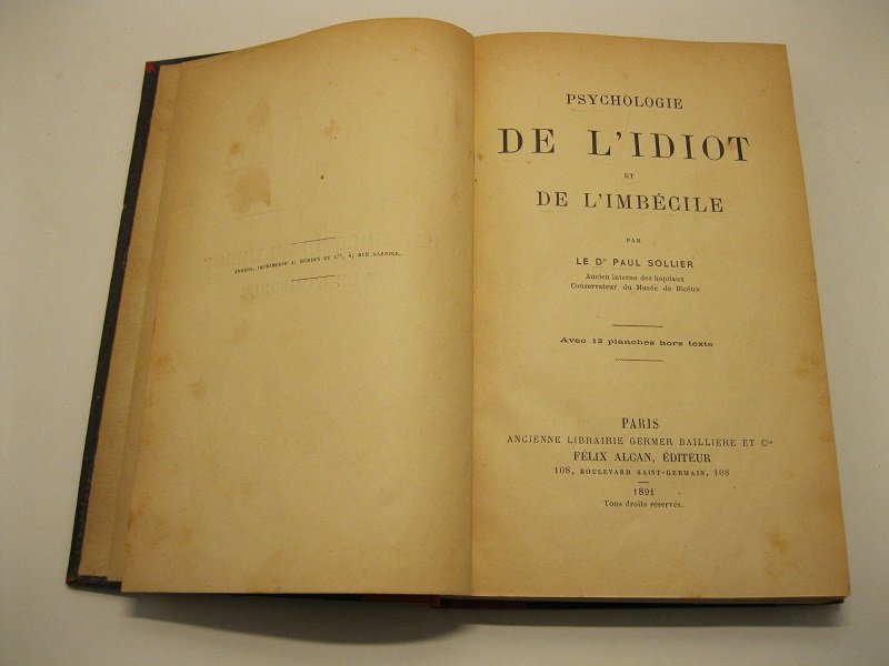 Psychologie del'idiot et de l'imbecile, par le Dr. Paul Sollier, Ancien interne des hospitaux Conservateur du Muse'e de Bicetre. Avec 12 planches hors texte