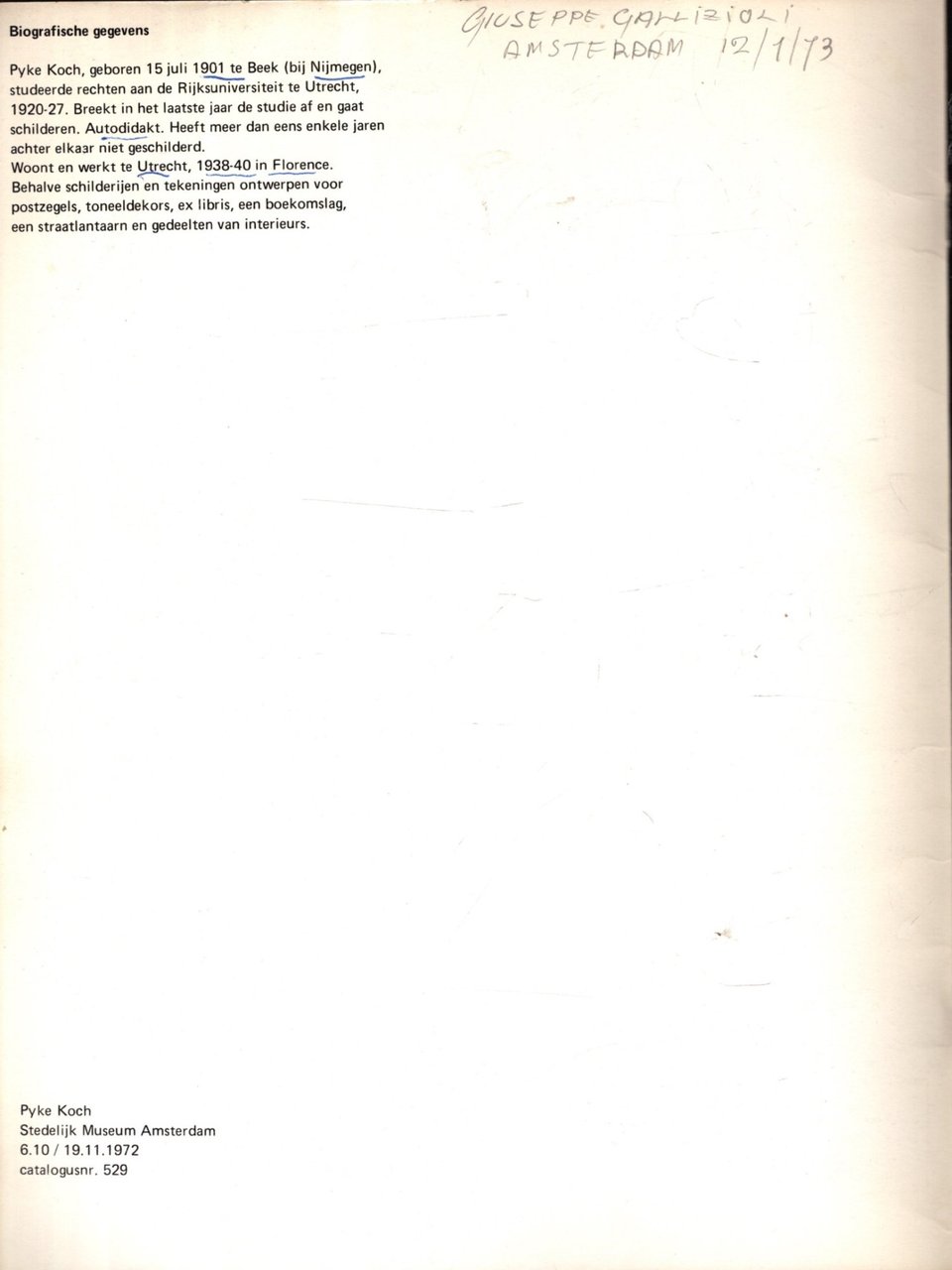 In 8 (cm 20,5 x 27,5), pp. (32) con riproduzioni fotografiche di opere in bianco/nero. Brossura editoriale. Conservata una cartolina all'interno con illustrazione di un'opera dell'artista. Catalogo della mostra di Pyke Koch svoltasi allo Stedelijk Museum di Amsterdam nel 1972. Testo in olandese