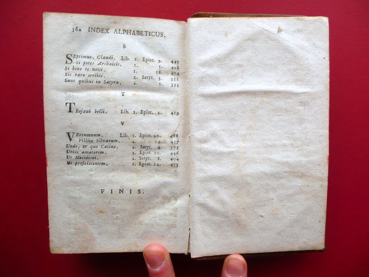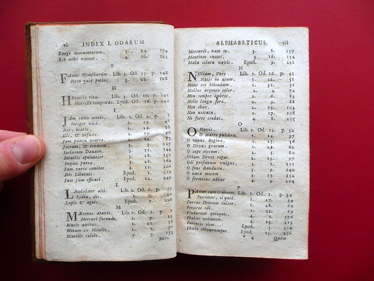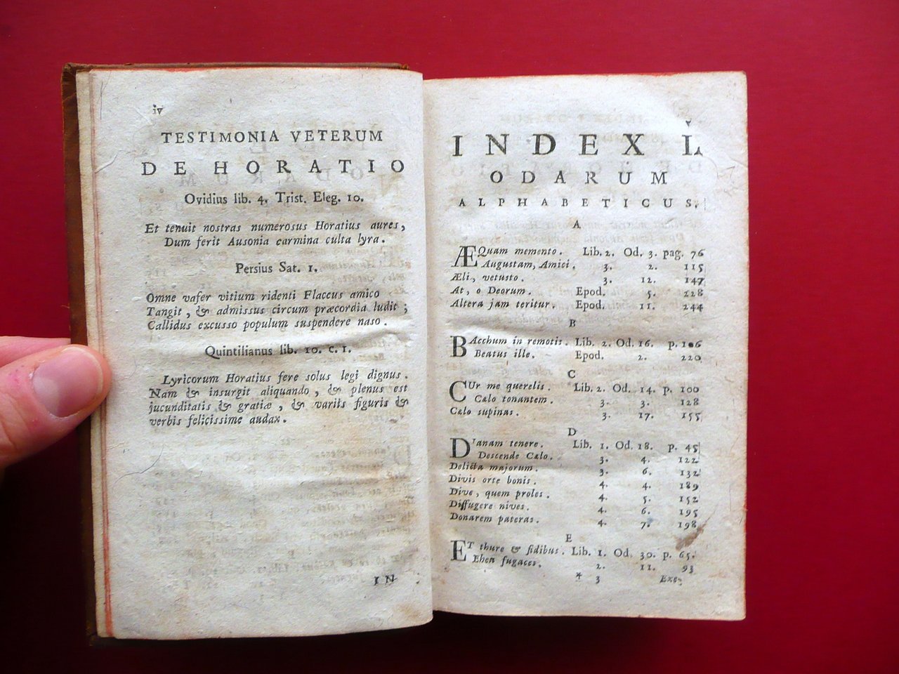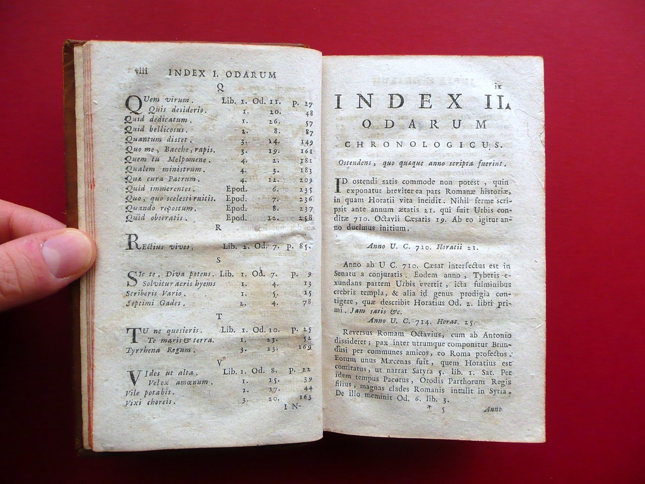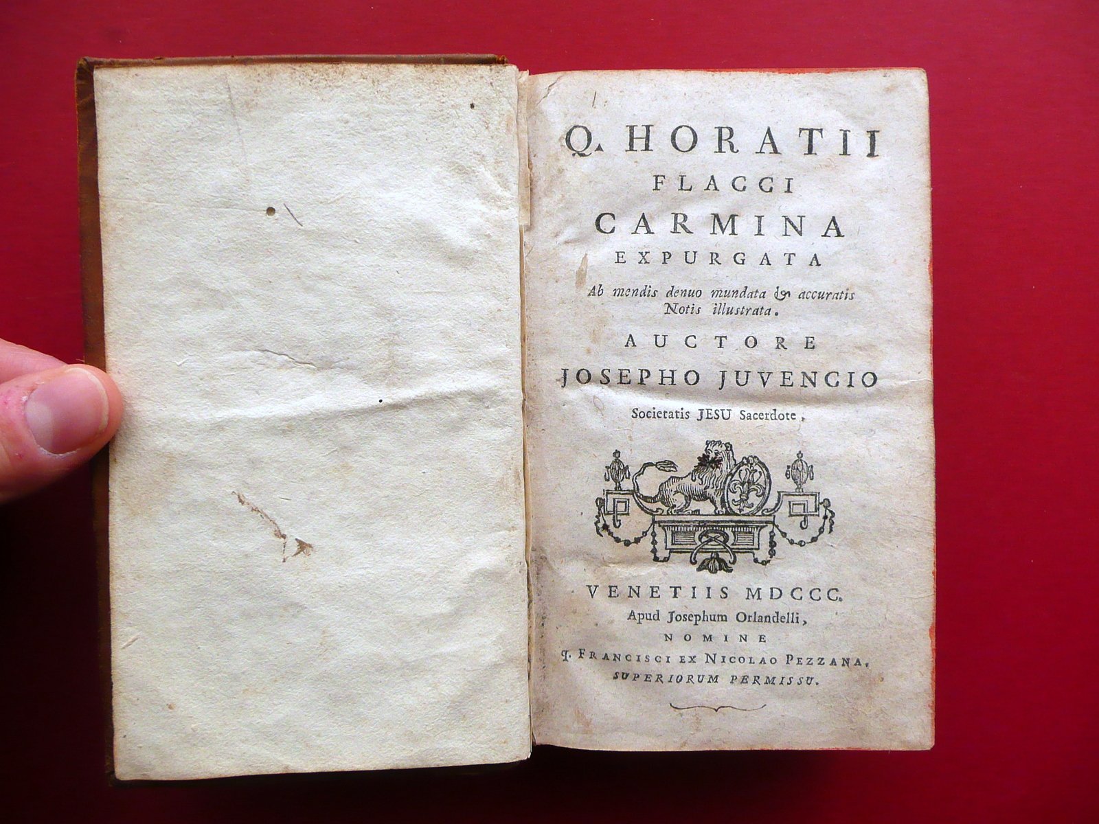 Q. Horatii Flacci Carmina expurgata ab mendis denuo mundata et accuratis notis illustrata auctore Josepho Juvencio societatis Iesu sacerdote Apud Josephum Orlandelli, Venetiis 1800; cm 16x9,5; pp. XXIV-562, con qualche piccolo fregio inciso in b/n; risguardi in bella carta varese. Legatura d'epoca in piena pelle con fregi impressi in oro; titolo impresso in oro entro tassello al dorso; tagli rossi. Condizioni di conservazione Esemplare in buono stato con tracce d'uso, coperta con alcuni minuscoli difetti e piccole lievi abrasioni, queste ultime prevalentemente agli angoli dei piatti e alle cerniere. Interni buoni con alcune piccole lievi bruniture. Elegante legatura d'epoca in piena pelle. Risguardi in bella carta varese. SETT9.L19129 N P