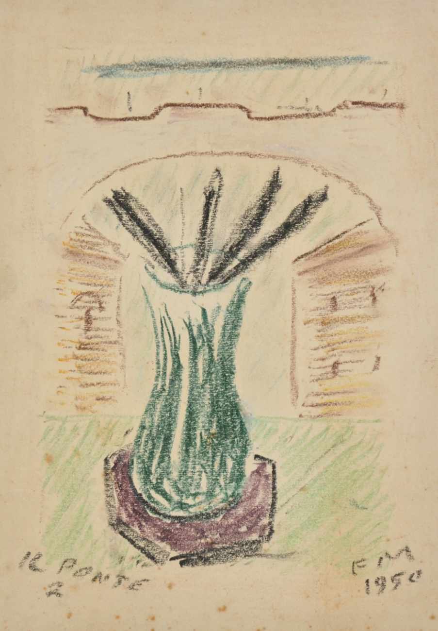 EPHEMERACON AUTOGRAFO.Firmato «EM» e datato 1950. Montaggio conservativo in cornice sotto vetro museale.«Qualche anno fa a Parigi portai alcuni quadri e disegni ad un vecchio artigiano perché facesse le cornici. Più che vecchio era antico, appartenente a una razza civile che si sta estinguendo anche in Francia (più lentamente che in Italia), quella dell’artigiano colto. Guardò con indifferenza quadri e disegni che portavano firme note, e si fermò su uno: questo è il più bello. Si capisce che non è un pittore di professione. Ma è pieno di talento, dev’essere un poeta». (Guido Piovene cit. in Marcenaro, p. 38) -- Montale cominciò a dipingere con continuità a partire dal 1945, dopo aver imparato i rudimenti della pittura da Raffaele De Grada e Guido Peyron. Passò dagli olii su tela alle opere su carta di piccole dimensioni, eseguite con pastelli ma anche con materiali di fortuna (vino, caffè, cenere) e su supporti improvvisati (carta da pacchi e cartoni colorati). In termini scherzosi e ossimorici, definì la sua opera pittorica «una sintesi tra de Pisis e Morandi». -- Negli ultimi anni non sono mancate le mostre che hanno ospitato le sue opere, e basti qui ricordare «La tavolozza color foglia secca di Eugenio Montale», Monterosso al Mare (1991), «Eugenio Montale: parole e colori», Cernobbio (2002), «De Pisis e Montale: le occasioni tra poesia e pittura», Mendrisio (2012), «Amare un’ombra, omaggio a Montale poeta e pittore», San Severino Marche (2016).Le linee della mano. Dipinti, schizzi, parole di Eugenio Montale. Inediti da collezioni private, a c. di Roberto Cresti, San Severino Marche, Archivio storico Bellabarba, 2016; Montale pittore, a c. di Francesco D’Episcolo, Salerno-Roma, Rispostes, 1996; La tavolozza color foglia secca di Eugenio Montale. Monterosso al Mare, agosto-ottobre 1991, a c. di Giuseppe Marcenaro, Genova, Sagep, 1991; Montale, Eugenio, Pastelli & Disegni, con uno scritto di Franco Russoli, Milano, All’insegna del pesce d’oro, 1966.